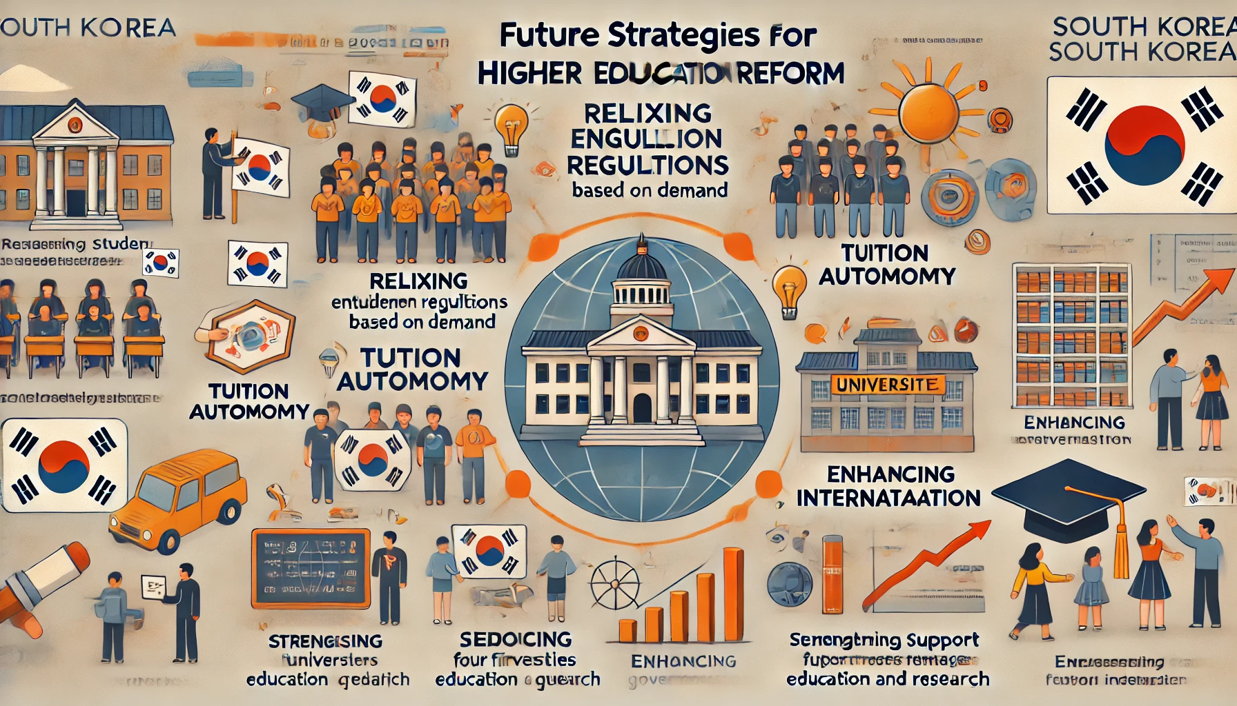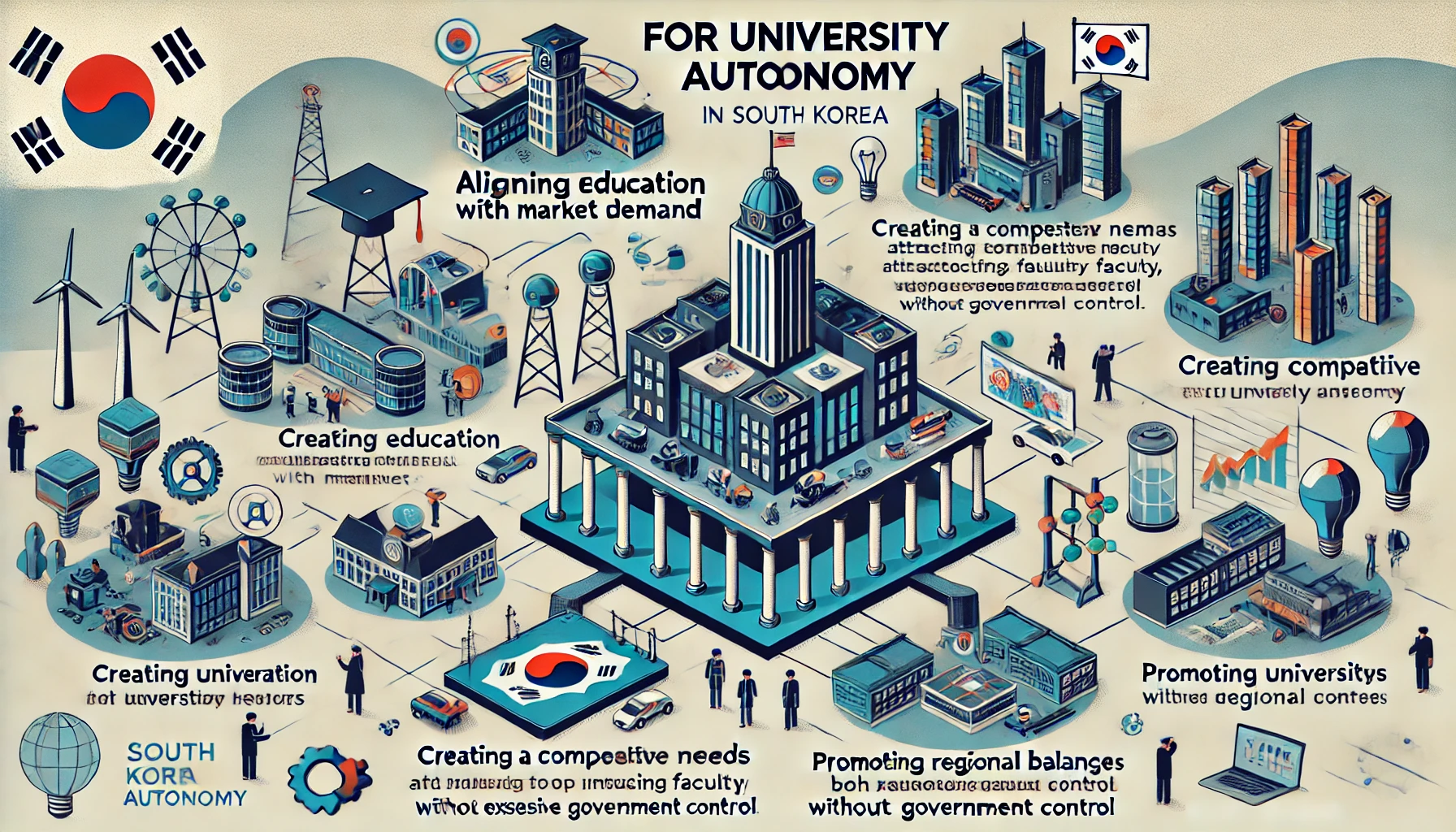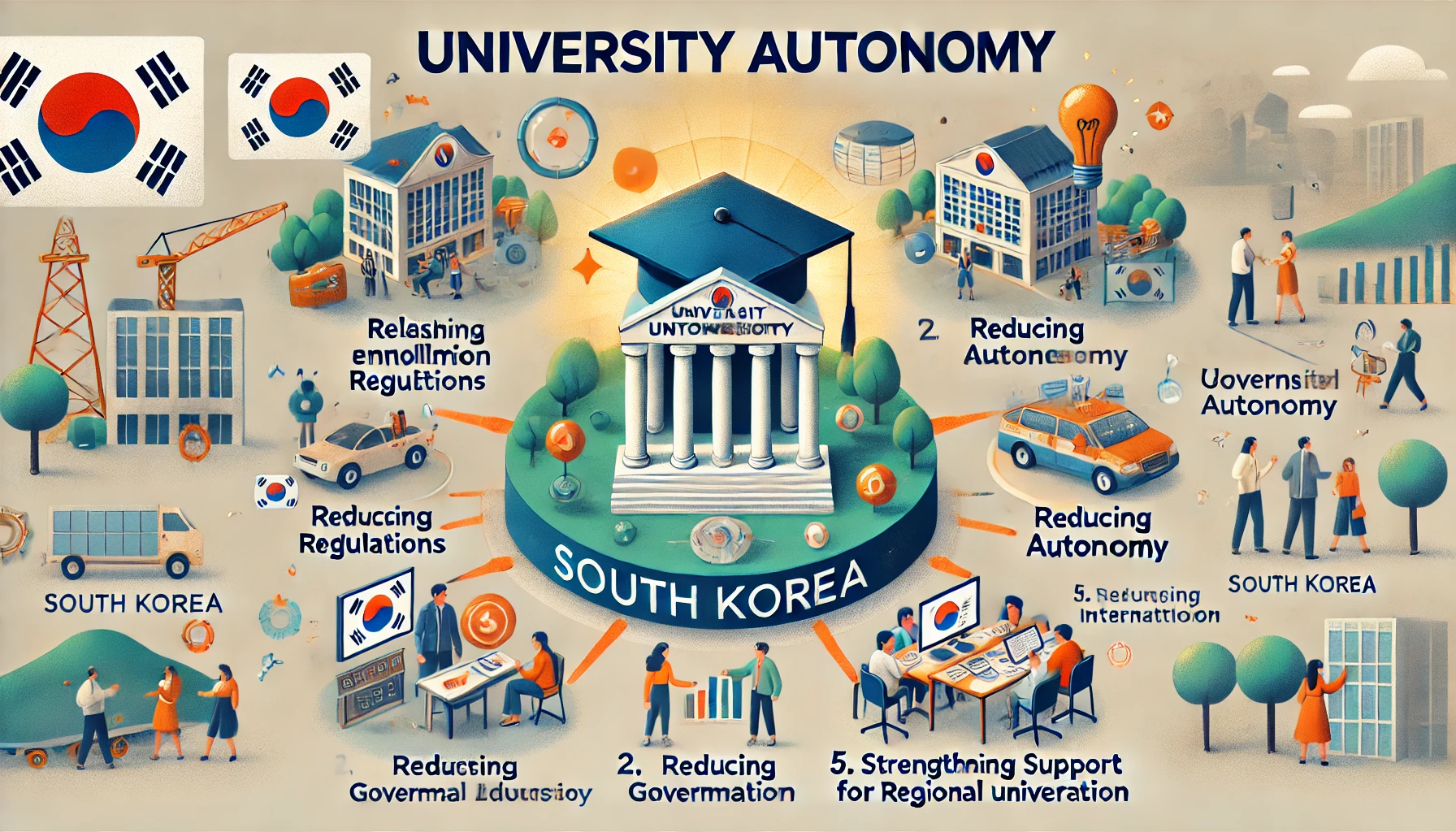 한국의 고등교육은 현재의 구조적 문제를 극복하고, 미래를 준비하기 위해 대학 자율화를 반드시 실현해야 합니다. 입학 정원 규제 완화, 등록금 자율화, 정부의 역할 축소, 지역 대학 지원 강화, 그리고 국제화 전략 강화는 대학 자율화를 위한 핵심 방안으로 제시될 수 있습니다. 이러한 변화는 단순히 대학의 생존을 넘어, 국가 경쟁력을 강화하고, 시대가 요구하는 인재를 양성하는 데 기여할 것입니다.