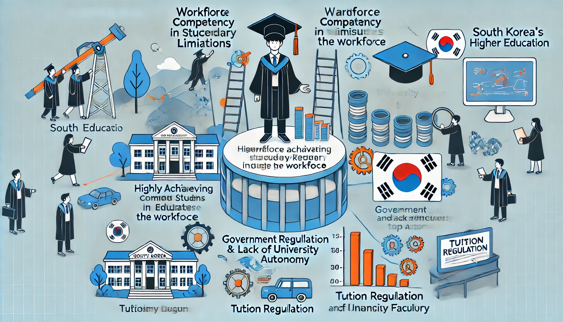 한국의 고등교육은 세계적으로 높은 초중등 학업성취도와 대비되는 대학 교육의 질적 문제로 인해 심각한 도전에 직면해 있습니다. 생산가능 인구의 역량은 OECD 국가 중 하위권에 머물러 있으며, 근로자의 전공과 업무 간 불일치 수준은 최상위권이라는 점은 한국 고등교육의 구조적 문제를 여실히 보여줍니다. 이러한 상황은 단순히 교육의 양적 확대만으로 해결될 수 없으며, 대학의 자율성을 강화하고 시장 수요에 부합하는 인재 양성 체계를 구축해야 한다는 목소리가 커지고 있습니다.