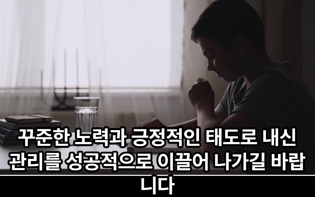 내신 관리는 단순히 공부 시간을 늘리는 것이 아니라, 효율적으로 계획하고 실천하는 데 달려 있습니다. 예습과 복습, 정리 노트 작성, 기출 문제 풀이 등 체계적인 학습 방법을 활용하면 내신 성적을 효과적으로 관리할 수 있습니다. 또한, 생활 관리와 멘탈 유지도 학습 효율을 높이는 데 중요한 역할을 합니다. 꾸준한 노력과 긍정적인 태도로 내신 관리를 성공적으로 이끌어 나가길 바랍니다.