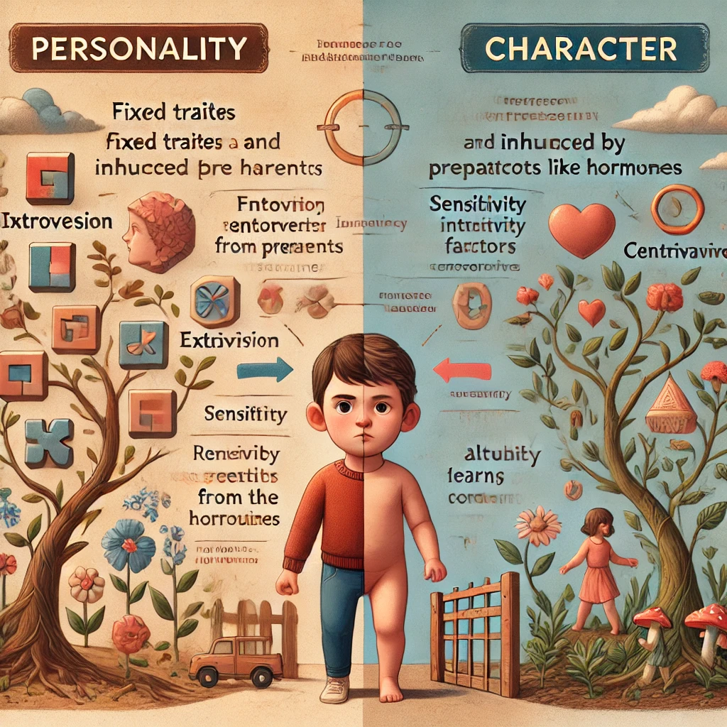 성격은 부모로부터 물려받은 유전적 요인과 태아 시절의 환경적 요인에 의해 결정됩니다. 예를 들어, 어머니가 임신 중에 분비하는 호르몬(테스토스테론, 에스트로겐 등)이 아이의 성격 형성에 큰 영향을 미칩니다. 반면, 성품은 후천적인 경험과 학습을 통해 변화할 수 있습니다.
