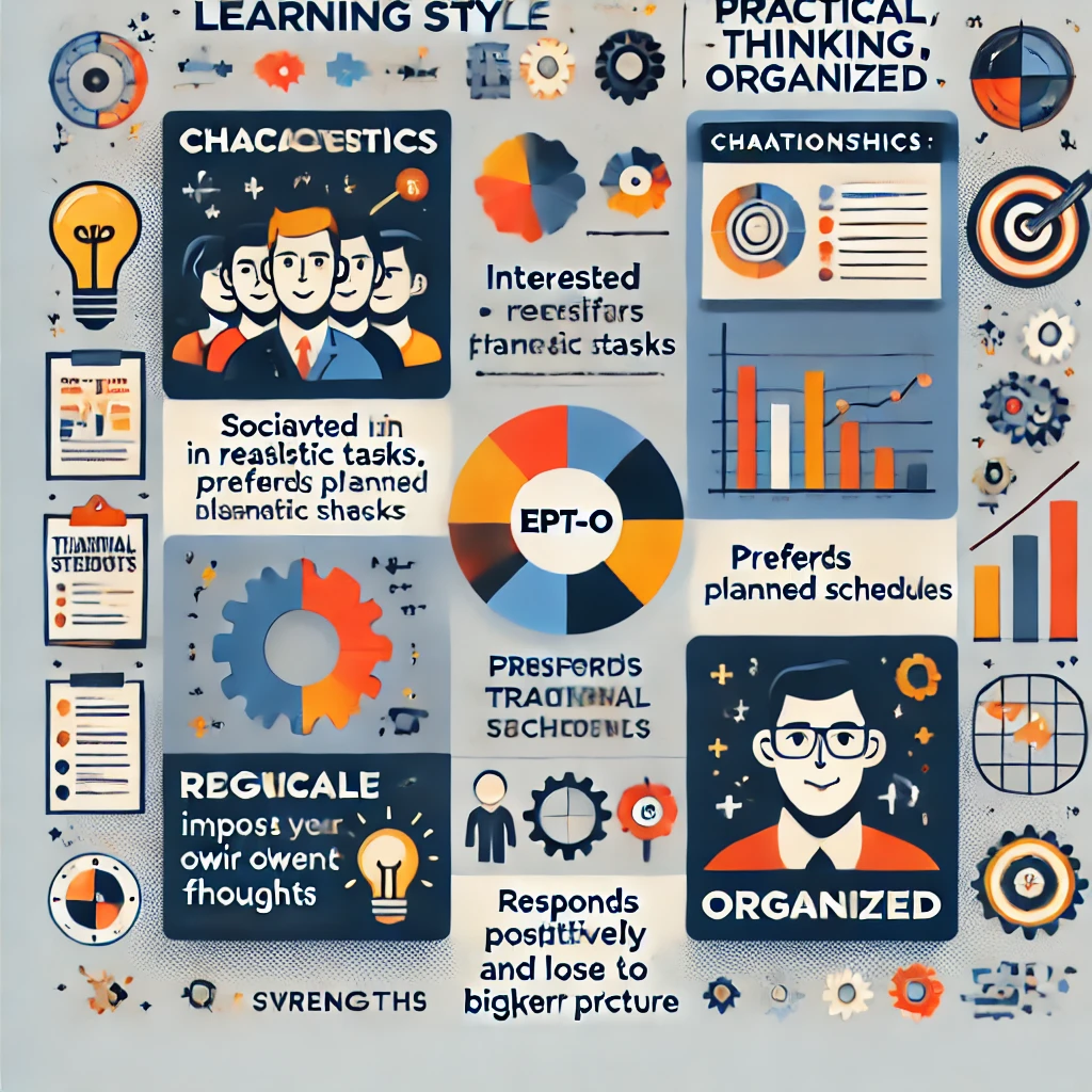 - 특징: 사교적이며 현실적인 일에 흥미를 느끼고, 계획된 일정과 정해진 순서를 선호합니다. 논리적이고 책임감이 강하며,부적인 일에 주의를 기울이는 경향이 있습니다.