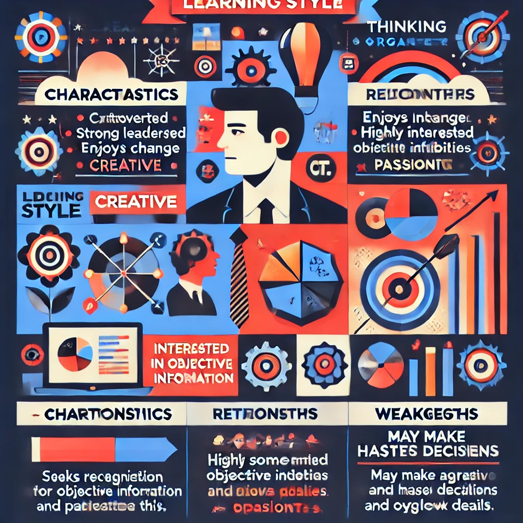 - 특징: 창조적이고 리더십이 강하며, 변화를 즐깁니다. 객관적인 정보에 관심이 많고, 열정적입니다.