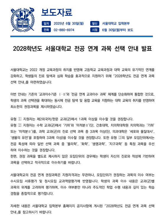🎓 2028학년도 서울대학교 전공 연계 과목 선택 안내 분석