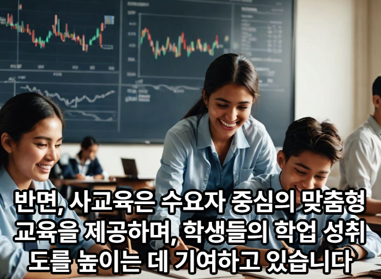반면, 사교육은 수요자 중심의 맞춤형 교육을 제공하며, 학생들의 학업 성취도를 높이는 데 기여하고 있습니다. 사교육은 학생 개개인의 학습 수준과 요구를 반영하여 맞춤형 커리큘럼을 제공하며, 이는 학생들이 자신의 학습 목표를 보다 효과적으로 달성할 수 있도록 돕습니다. 또한, 사교육은 공교육에서 다루지 않는 심화 학습이나 특정 시험 대비를 위한 전문적인 교육을 제공함으로써, 학생들에게 추가적인 학습 기회를 제공합니다.